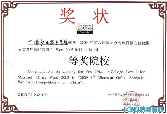 新闻网讯 (通讯员 彭远)10月23日上午,第四届湖北省教育信息化核心技能大赛表彰会暨第一届“e21杯”湖北省“极品飞手”计算机录入竞赛活动启动仪式在武汉隆重举行。公司荣获“2009年第八届国际办公软件核心技能世界大赛中国区决赛”WORD2003项目大学组一等奖院校和“湖北省教育信息化核心技能大赛优秀组织公司”称号。省教育厅副厅长徐金山、科技处处长赵泽刚、高教处处长张建军、职成处调研员唐其华出席大会,并为获奖单位和获奖教师颁奖。