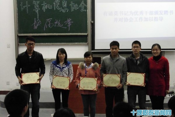 莫足琴书记和赵俊杰老师为协会优秀干部颁发了聘书,信息与智能工程系员工会主席赵亚坤为协会优秀干事颁发荣誉证书。现任计算机信息协会主席王勇对这一年的工作做了汇报总结。