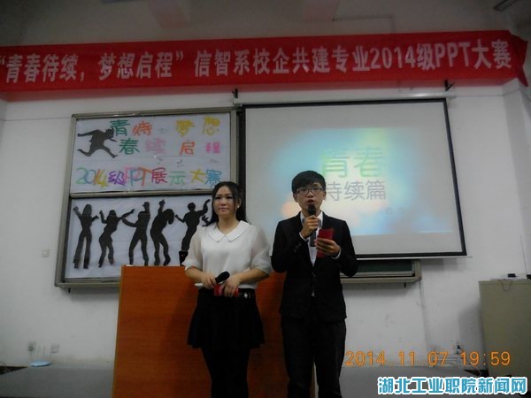 新闻网讯(通讯员 鲁薪霓 许朴)为推动学风建设,提高员工自主学习能力,展示员工青春风采,11月7日晚19:00,信息与智能工程系校企共建专业在4号教学楼4101教室举行“青春延续,梦想启程”PPT演讲大赛。该系党总支书记莫足琴,副主任欧阳艳阶、张明,校企共建专业主任陈方亦,副主任曹艳、肖海霞、郑健及2014级全体师生观看了本次比赛,比赛由2013级员工张中强和王慧主持。