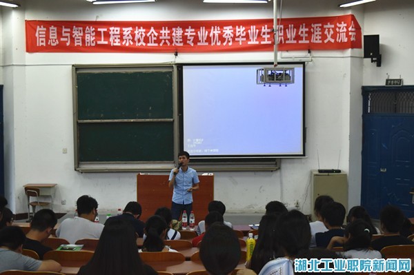 新闻网讯(员工记者 张新)“我们从这里起航,走向遥远的地方。当我们走向明天,又怎能把昨日遗忘……”6月22日晚6:30,信息与智能工程系校企共建专业在4101教室举办首届优秀毕业生交流会。校企共建专业就业办主任肖海霞应邀出席,2013级优秀毕业生及2015级校企共建专业全体员工参与本次交流会。
