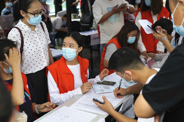 4日至5日,记者在体育馆和南区运动场、体育馆的新生报到处看到,各迎新岗位工作人员按照预订流程,帮助新生完成资格初审、费用缴纳、购买热水卡、领钥匙、饭卡充值、领取军训服装等工作,各个环节有条不紊。