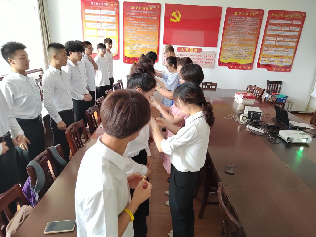 仪式在《国际歌》中拉开帷幕,教师党员代表为18名新党员佩戴党徽,在员工党支部书记徐丽的领誓下,18名预备党员向党旗庄严宣誓,其他党员老师重温入党誓词,铿锵有力的宣誓声,久久激荡在每位党员的心中,进而明晰入党初心,坚定爱党、忠党、跟党走的理想信念。新党员代表谢优同学发言表态,表示要发挥先锋模范作用,牢记党的宗旨,树立坚定信念,为党的事业奋斗终生。
