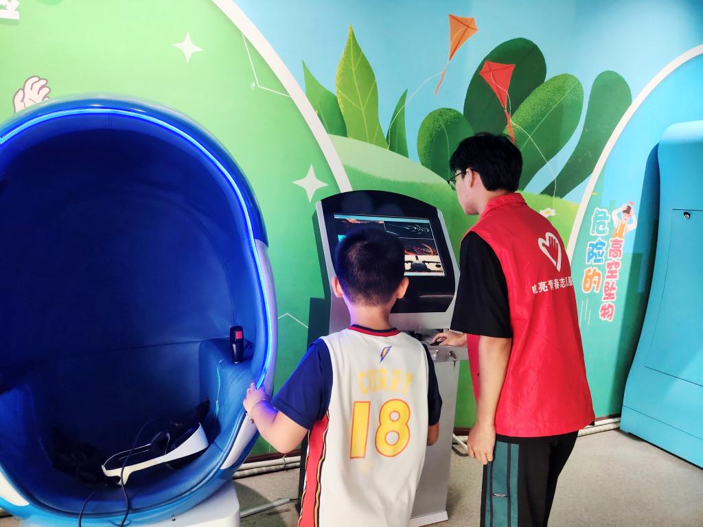 活动伊始,电亮青春服务队志愿者熟练地操控着会跳舞的机器人,伴随着动感的音乐,机器人灵活地摆动肢体,吸引了众多参观者驻足观看。VR体验区,体验者仿佛穿越时空,沉浸在虚拟世界的奇妙旅程中,感受科技带来的无限可能。通过“自己拉自己”小实验,志愿者还引导小朋友在物理学中感受科技的奥妙。志愿者还生动讲解了地球的演变史,揭开地球神秘的面纱,激发小朋友们对自然科学的想象和热爱。
