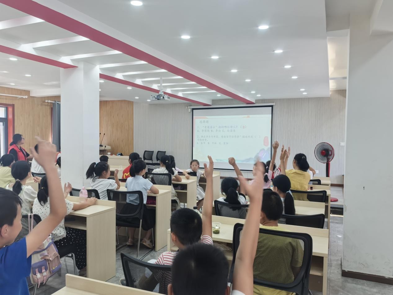 午后,古诗竞赛如期开展。“沙场点兵”环节里,孩子们接龙背诵含“兵器”意象的诗句,“黄沙百战穿金甲,不破楼兰终不还”的豪壮与“醉里挑灯看剑,梦回吹角连营”的激昂在室内交织;“移花接木”中,他们用“春”“月”“江”等意象重组诗句,在文字游戏中体悟古典诗词的韵律之美。“文学素养”问答环节,当被问及“为什么古人喜欢在诗中写月亮”时,二年级的乐乐抢答:“因为月亮像信使,能把思念带给远方的人!”稚嫩的回答道出了中国人“千里共婵娟”的文化密码。志愿者解释道:“古诗竞赛不只是知识比拼,更是引导孩子们触摸文化基因的过程。这些凝练的文字背后,是中国人特有的情感表达方式与哲学思考。”