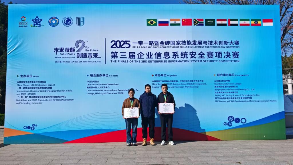 大赛由金砖国家工商理事会中方理事会、“一带一路”暨金砖国家技能发展国际联盟联合主办,对标世赛网络安全职业标准,全面考核企业系统安全运维、应急响应、漏洞挖掘及团队协作等综合能力。备赛期间,两名同学在公司教师左鑫指导下,全力投入集训,最终凭借扎实专业功底和稳定现场发挥斩获佳绩。